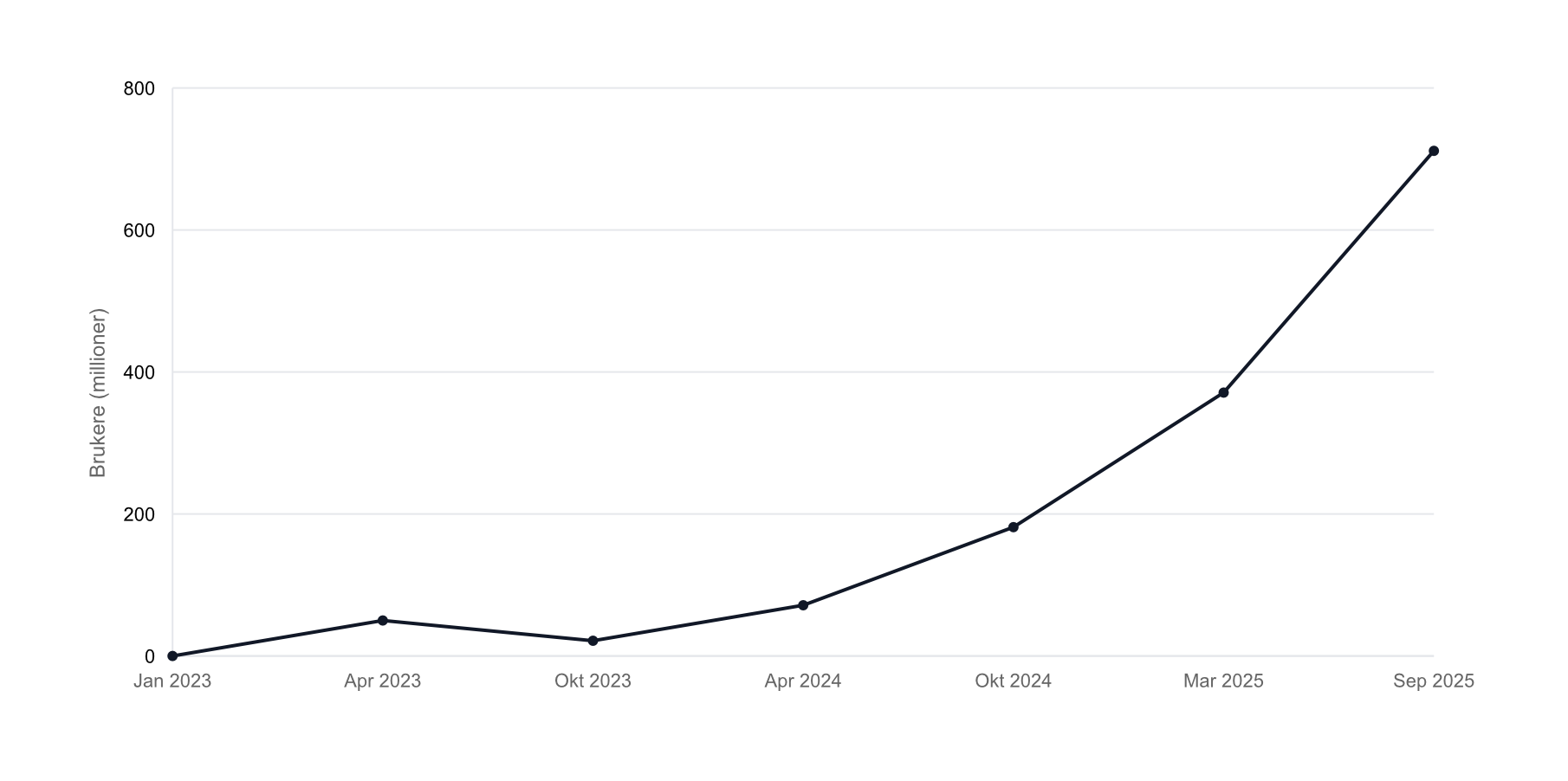 AI har på kort tid begynt å ta opp kampen mot søkemotorene, vi bruker de til å hente alt fra nyheter til forskningsartikler, til å forstå lover og begreper. Bare hos Open AI ble det sendt 18 milliarder meldinger ukentlig i Juli 2025, noe som tilsvarte rundt 10 % av den voksne befolkningen i verden.