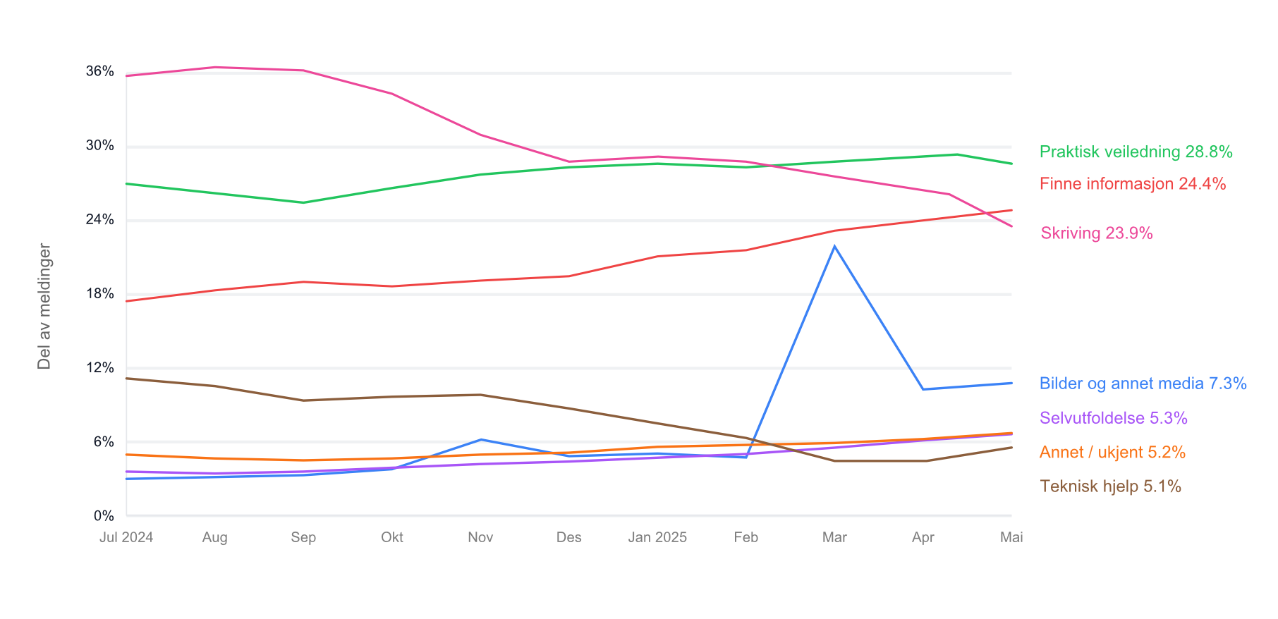 - Praktiske veiledning står relativt stabilt på 29 %. Spørsmål som: “Gi meg 10 idéer til kreative kampanjenavn for et lokalt bakeri?” eller “Hvordan lager jeg en enkel prosjektplan?”